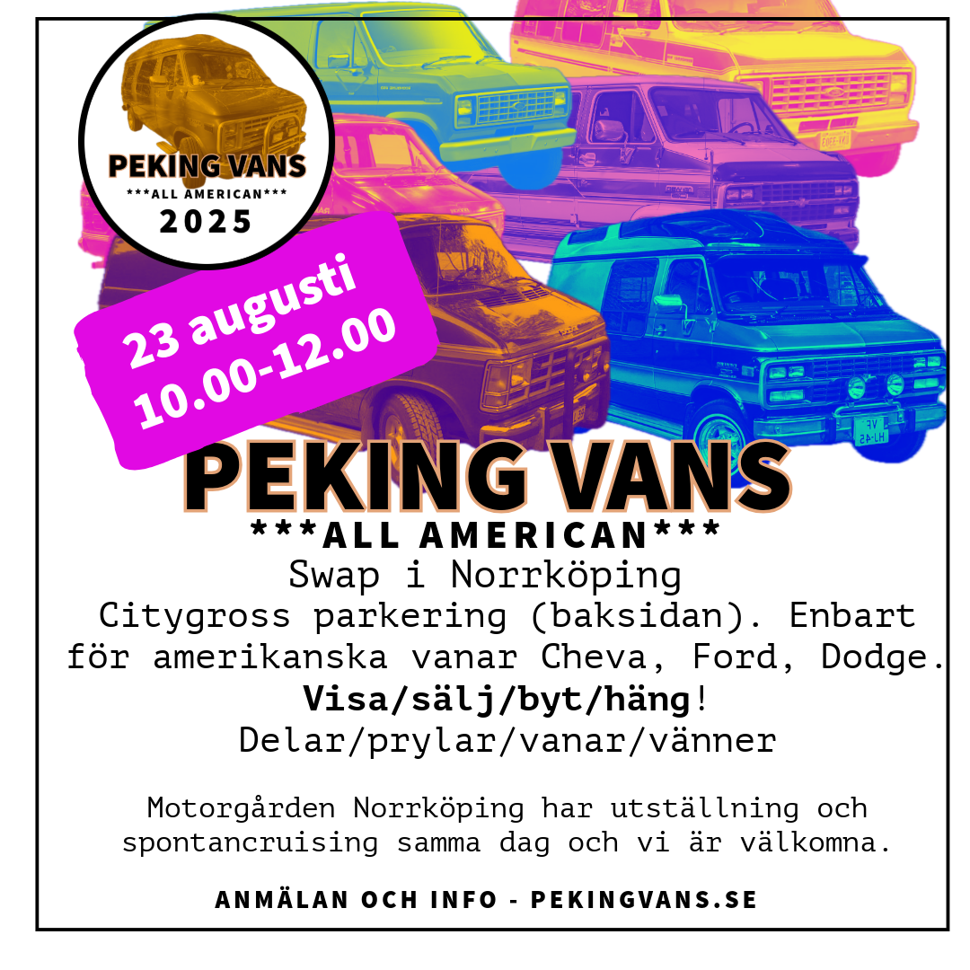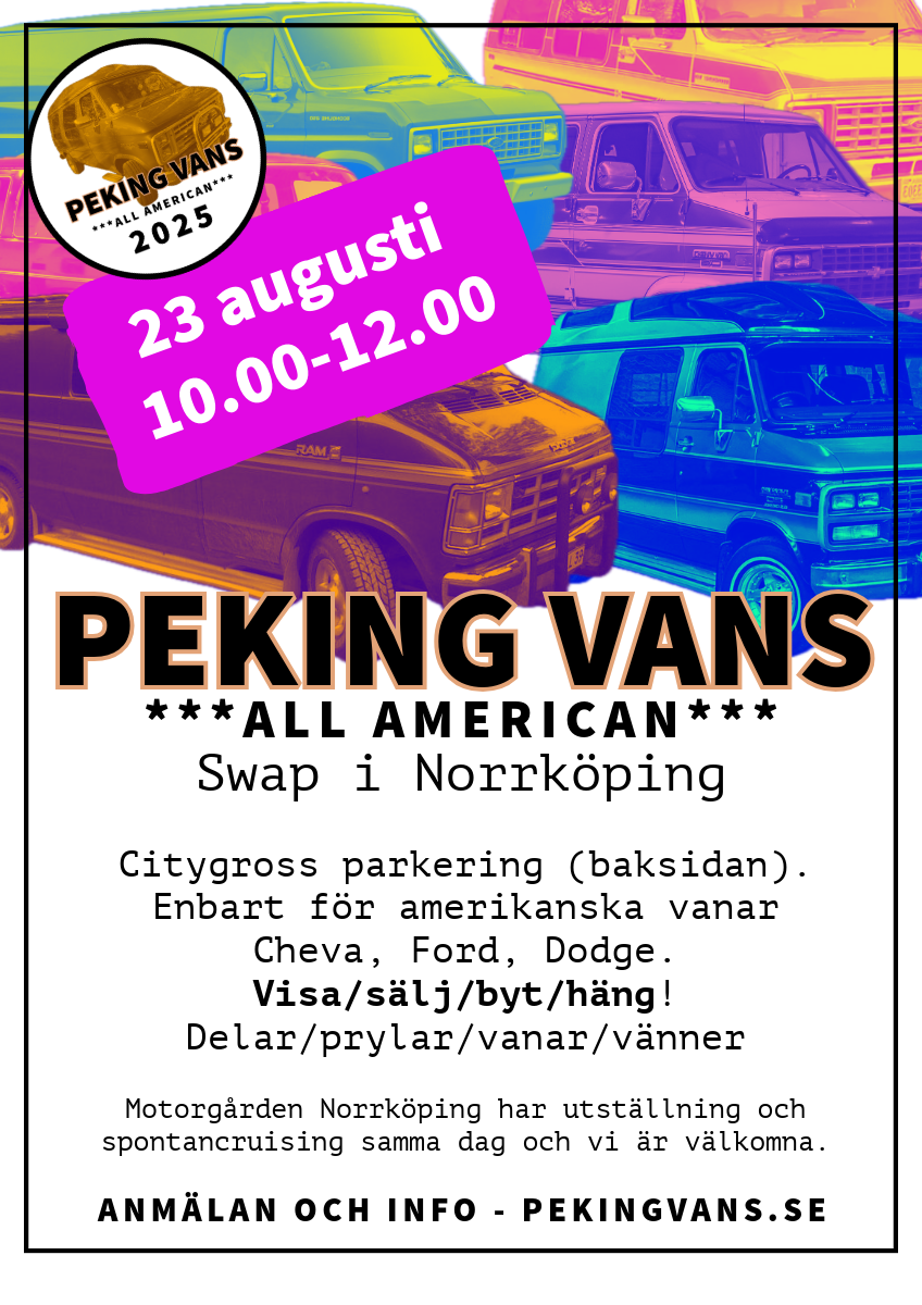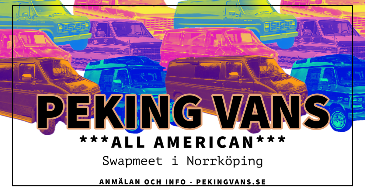 Swap för amerikanska vanar - ställ ut, ställ upp, kom och sälj! Allt för vanar av märken Cheva, Dodge och Ford. Ingen kostnad men anmäl gärna att du kommer till mail@pekingvans.se så att vi ser vilket intresse som finns och vad olika människor har med sig att sälja. Har du saker att plocka fram är du välkommen från kl 09.00.